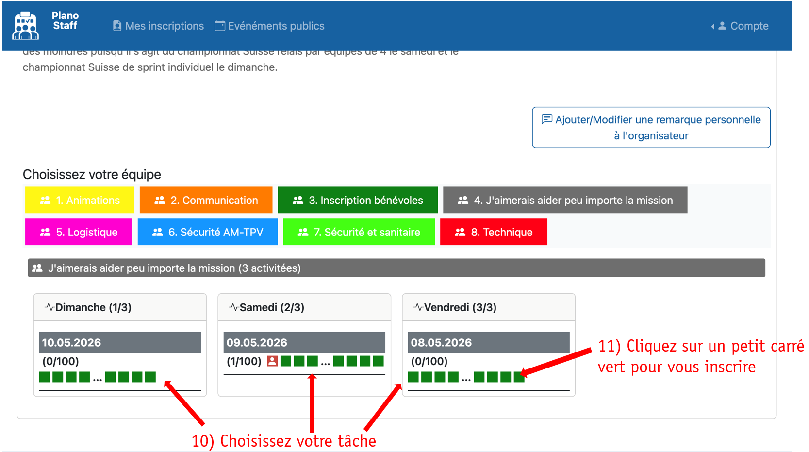 - La plateforme Planostaff nous permet également de prévoir les t-shirts, les repas, et le souper des bénévoles. Merci de vous inscrire de manière sérieuse et complète.